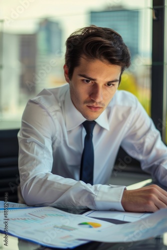 Professional Photography of young CEO analyzing financial reports, Generative AI