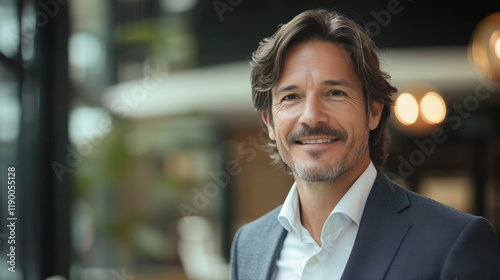 Professional portrait of a confident CEO smiling in business attire with a modern office background
