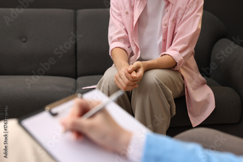 Professional psychologist working with patient and writing in clipboard in office, closeup
