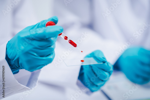 Professional scientists in lab working with blood samples. to find components in blood Ideas for inventing and researching drugs and viruses in blood system.