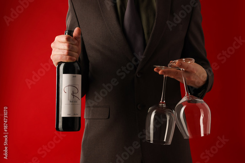 Professional sommelier with bottle of wine and glasses on red background, closeup