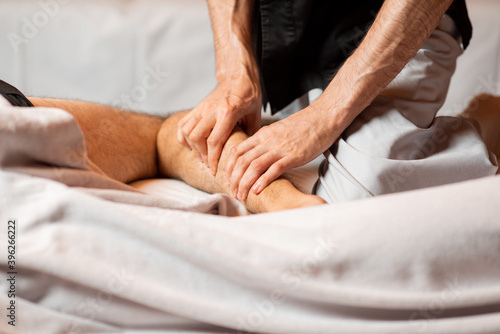 Professional therapist doing a deep massage to a male client at Spa salon. working on the lower body, close-up