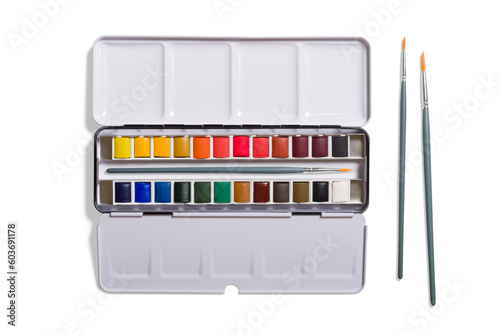 Professional watercolour set in metal box with brushes, full palette, isolated on a transparent background, PNG. High resolution.