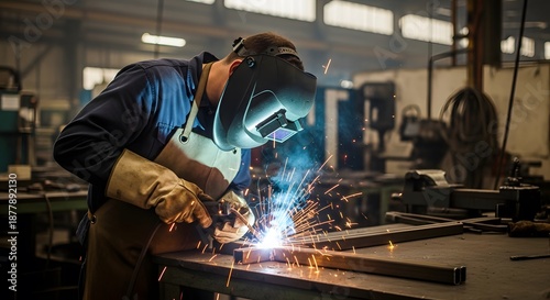 welder, welding, men at work, man, male, person, factory, industry, industrial, manufacturing, production, plant, metal, steel, iron, structure, construction, spark, fire, light, bright, heat, torch, tool, equipment, protection, safety, mask, helmet, gear, glove, job, career, skill, professional, technical, engineering, repair, maintenance, workshop, labor, manual, heavy, concentration, focused, active