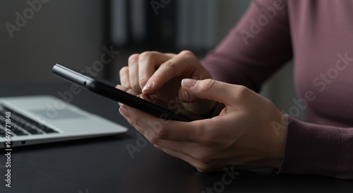 Professional Woman using Finger to Scroll and Touch Smartphone Screen on Dark Desk next to Laptop, Focus on Hand Gestures and Technology Use