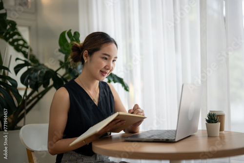 professional, woman, laptop, home office, productivity, technology, business, green plant, coffee cup, freelance, modern, entrepreneur, focused, writing, indoor, serene, cosy, stylish, asian, computer, reading, notebook, comfortable, concentration, self employed, planning, telecommuting, e-business
