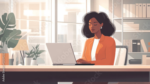 Professional woman working on a sleek laptop in a stylish office, representing productivity and a modern work culture.