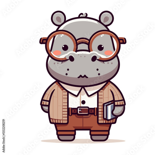 Professor hippo with glasses and cardigan holding book. Vector illustration for academic teaching, scholarly research or educational institution concepts.