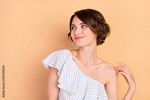Profile side photo of young girl happy positive smile hand touch shoulder look empty space isolated over beige color background