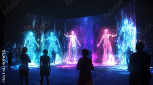 technology, wall, vibrant, contemporary, colours, futuristic, modern, glow, shape, interactive, people, screen, figure, illuminated, colourful, installation, glowing, human, light, art, digital, light, dynamic, visual, silhouette, abstract, performance, exhibition, design, display, concert, party, music, crowd, dance, rock, disco, night, silhouette, club, show, stage, nightclub, festival, entertainment, band