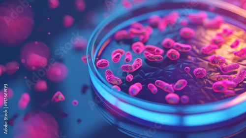 Prokaryotic colonies expanding in a petri dish under a UV light, with glowing biofilms, vibrant colors, photorealistic, high detail.
