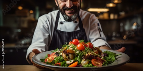 Proud chef presenting a fresh salad with a smile. gourmet dish in a cozy restaurant setting. healthy eating. AI