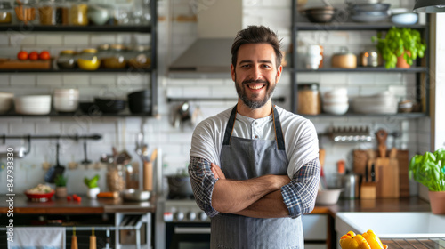 chef, kitchen, hobby, apron, cooking, modern, smile, smiling, man, standing, confident, shelf, dish, ingredient, home, interior, lifestyle, domestic, countertop, culinary, food, preparation, professional, epicure, happy, male, fresh, green, vegetable, workspace, portrait, indoor, satisfaction, craft, homelike, ambience, workstation, motivation, photogenic, casual attire, urban, bright, enjoying, successful, serene
