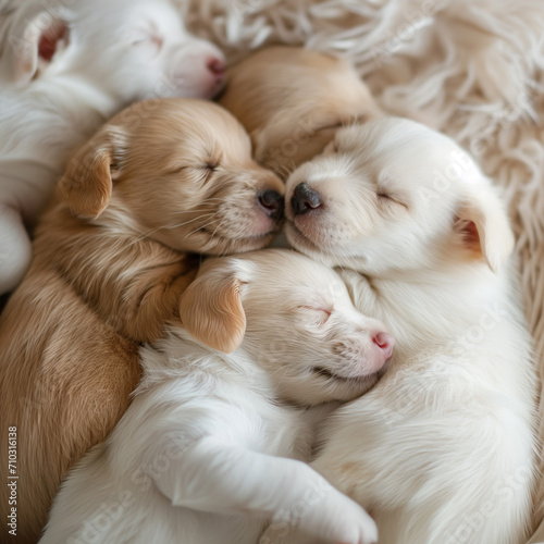 Puppies sleeping together in a pile, peaceful and serene setting