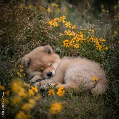 Puppy dreams. Sleeping pup nestled amidst wildflowers in a field, peaceful and serene