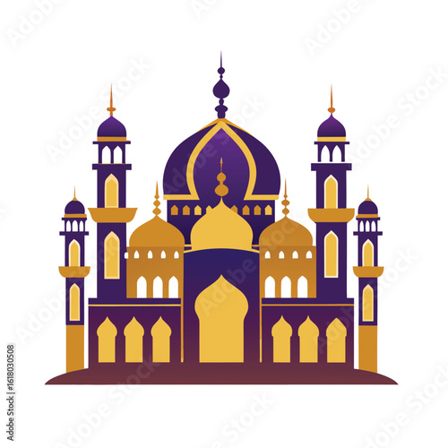 mosque, islamic, architecture, building, dome, minaret, purple, gold, religious, cultural, traditional, oriental, middle, eastern, muslim, worship, prayer, holy, sacred, ornate, design, illustration, vector, graphic, icon, symbol, isolated, white, background, ramadan