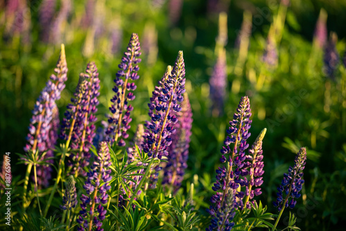 Purple blooming lupin on the field in summer. Bright sunny day, natural background, beautiful lupine flowers in blossom under the warm sun light on sunset