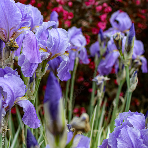 purple iris with pink weigela flowers in the background. landscaping design pairing. abstract floral banner or design element