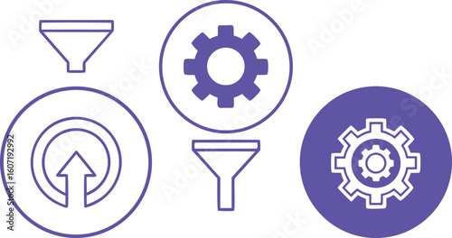 process, gear, funnel, arrow, icon, purple, outline, workflow, mechanism, engineering, development, progress, system, operation, strategy, business, technology, digital, graphic, symbol, concept, clean, simple, modern, design, element, abstract, industry, production