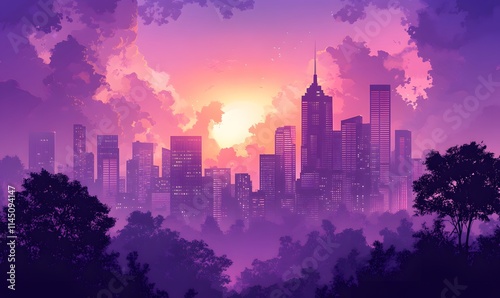 Purple Serenity, Vector Cityscape with Trees and Modern Buildings Under a Cloudy Sky