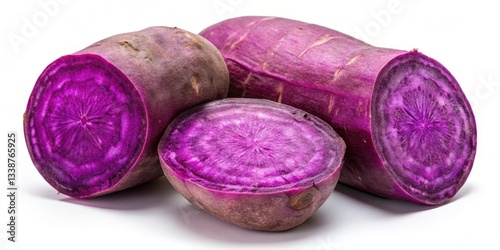 Purple Sweet Potato Photography: Halved Sweet Potato on White Background - Stock Image