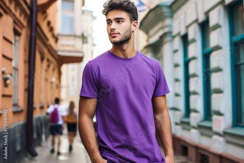 Purple T-Shirt Wearing Man On The Street, Mockup