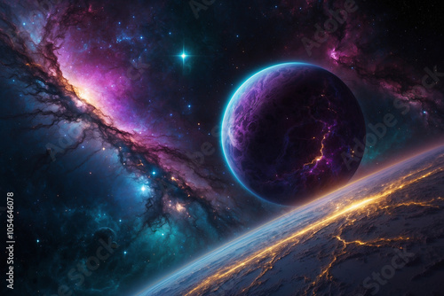 Purple-hued planet with cyan and gold nebula; vibrant stardust trails sparkle, creating a surreal backdrop