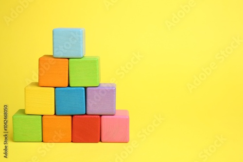 Pyramid of colorful cubes on yellow background. Space for text