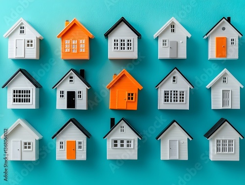 Quaint collection of minimalist white residential structures with a singular orange home standing out amidst the crowd showcasing real estate photography of model properties for prospective buyers