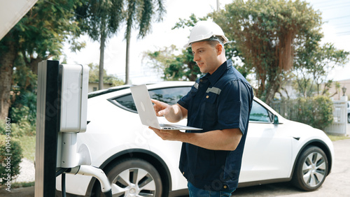 electric car, electric, car, charging, battery, charger, technician, work, laptop, technology, charge, station, home, vehicle, sustainable, eco, green, alternative, maintenance, install, installation, construction, panel, electrical, inspecting, labor, men at work, employee, connection, service, equipment, expertise, cable, technical, professional, system, platform, plug, fuel, recharge, transport, sustainability, troubleshooting
