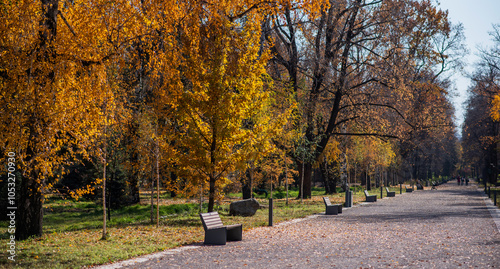 Quiet autumn park scene with golden yellow leaves on trees, empty benches, and a path covered with fallen leaves, evoking a sense of calm and solitude