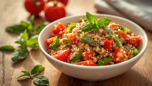 Quinoa tabbouleh salad in a bowl, a nutritious meal featuring tomatoes and mint, World Health Day