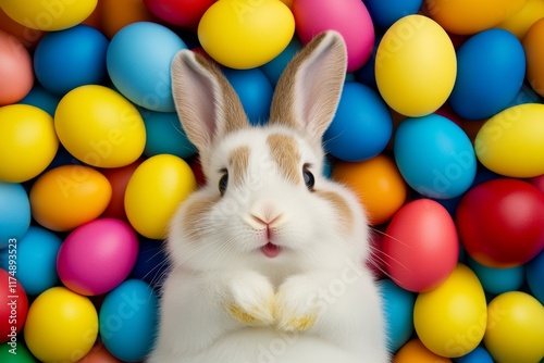 Rabbit is laying in a pile of colorful eggs. The eggs are in various colors, including yellow, orange, and red. The rabbit is looking up at the camera, seemingly curious or surprised by the eggs