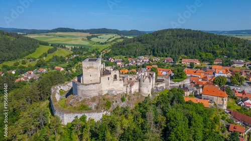 castle, aerial, landscape, city landscape, countryside, panorama, field, rural, agriculture, village, building, house, rooftop, ruin, gothic, bohemia, bohemian, czech, czech republic, europa, historic, historical, history, old, architecture, landmark, travel, south, blue, destination, fort, fortification, fortified, fortress, green, roof, stronghold, tower, culture, european, stone, remnant, sight, central, church, town