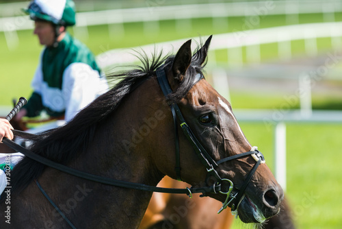 Race horse on the track side profile portrait