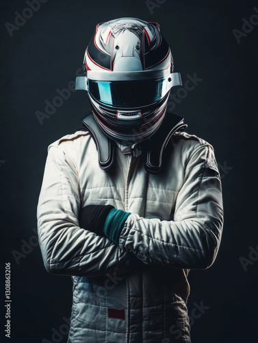 Racing driver in full gear with helmet and suit, arms crossed, against dark background.