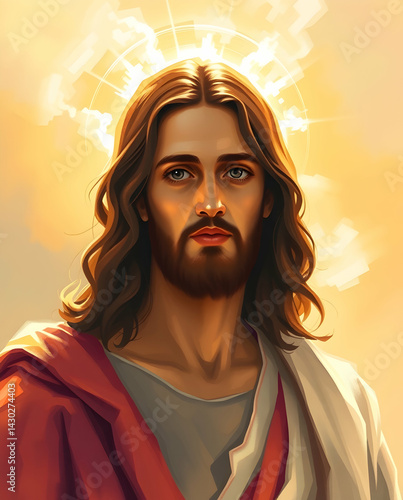 jesus christ, jesus christ, impressionist, painting, morning, light, divine, holy, serene, peaceful, glowing, spiritual, sacred, aethereal, warmth, gold, soft, dreamlike, harmony, expressive, texture, radiant, grace, robe, pastel, cloud, aura, devotion, calm, portrait