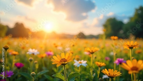 Radiant sun illuminates a vibrant field of wildflowers, conveying pure joy and serenity Perfect for themes of wellbeing, positivity, and inner peace , carefree, cheerful, uplifting