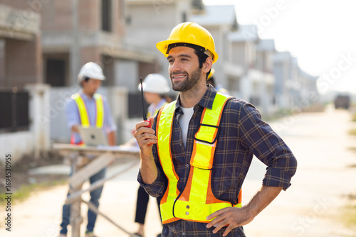 Radio Hispanic male engineer talking on walkie talkie transmitter, radio : Architect, contractor and architecture standing in house building under construction site.safety harthat helmet, teamwork