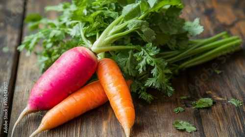 Radishes and carrots on table