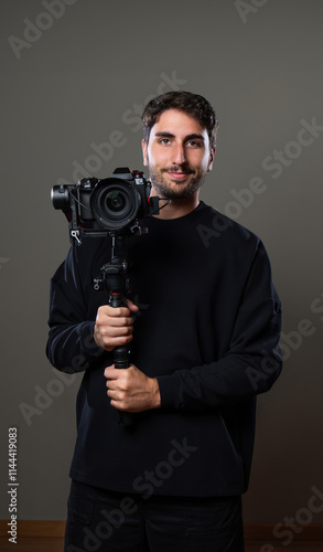 ragazzo videomaker con macchine fotografica e stabilizzatore