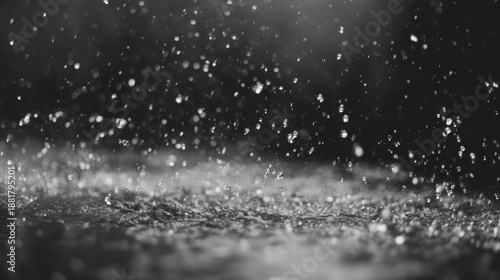 Rain drops falling on asphalt in monochrome, creating splashes. Abstract black background with water and wet texture for wallpaper design.
