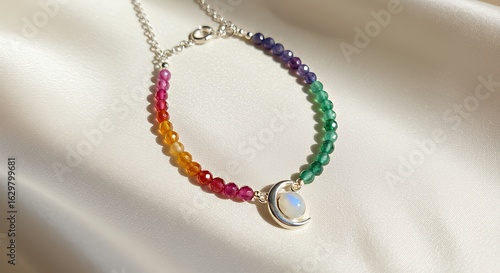 Rainbow Beaded Necklace with Moon Pendant on White Satin Fabric
