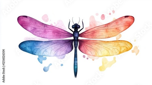 Rainbow Dragonfly Watercolor: A vibrant, colorful dragonfly painted in watercolor with intricate detail and a splash of abstract color. The vibrant wings capture the beauty of nature.