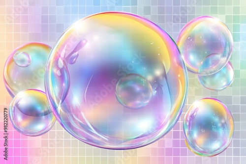 Rainbow gradient bubbles floating on a vibrant abstract background with light reflections and bokeh effect - Generative ai. Beautiful simple AI generated image