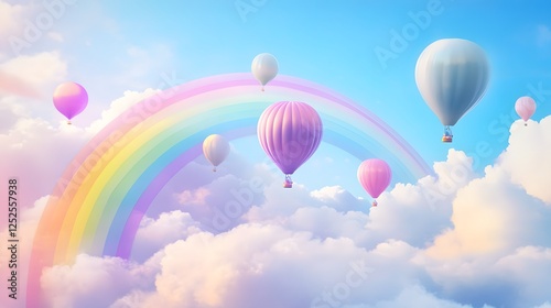 Rainbow Hot Air Balloons: Pastel-colored hot air balloons drift serenely amidst fluffy clouds, a vibrant rainbow arching across the dreamy sky, creating a whimsical and enchanting scene.