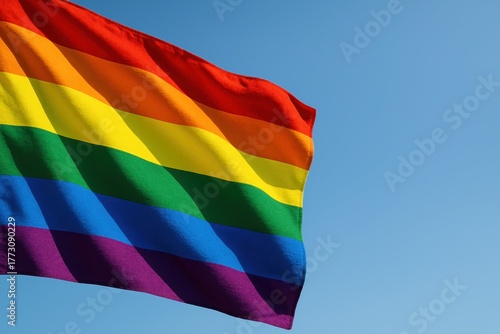 Rainbow pride flag waving in soft wind against clean blue sky vibrant inclusive symbol