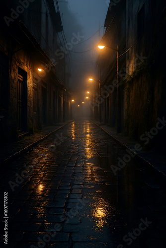 Rain-Soaked Narrow Alley with Streetlights in Southeast Asia at Night
