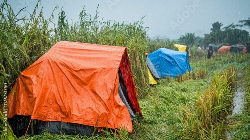 rainy, season, tent, outdoors, camping, field, vegetation, cloudburst, deluge, wet, soaked, orange, blue, yellow, shelter, temporary, protection, flood, disaster, relief, rural, agricultural, grassy, plant, storm, tempest, weather, nature, environment