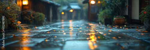 rain, japan, wet, fallen leaves, light, low angle, pathway, paving, raindrop, rainy day, autumn, fall, street, city landscape, urban, building, architecture, town, street scene, landscape, nature